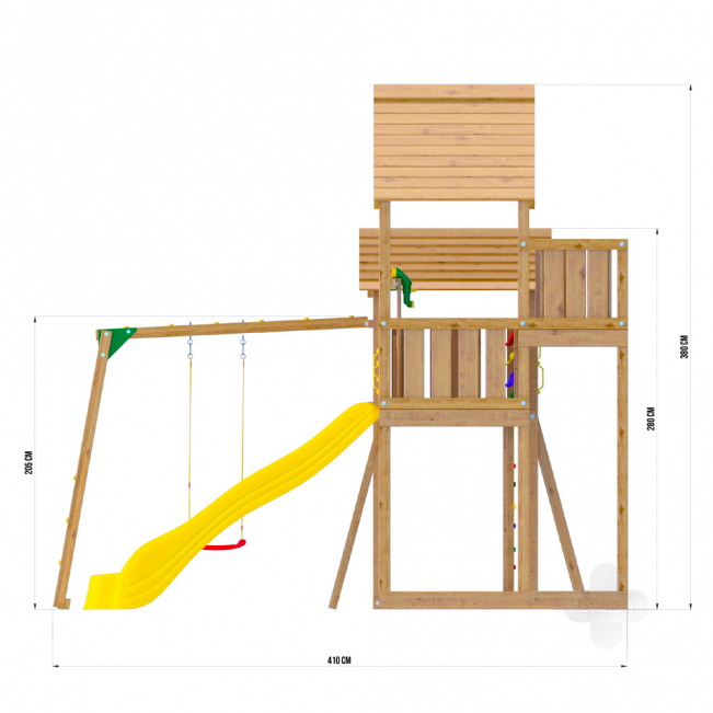 Игровая площадка изготовлена из клееного соснового бруса и массива сосны .Дерево обработано безопасной декоративно-защитной пропиткой. Технология значительно увеличивает срок службы конструкций, повышает прочность древесины, защищает её от гниения и грибков.